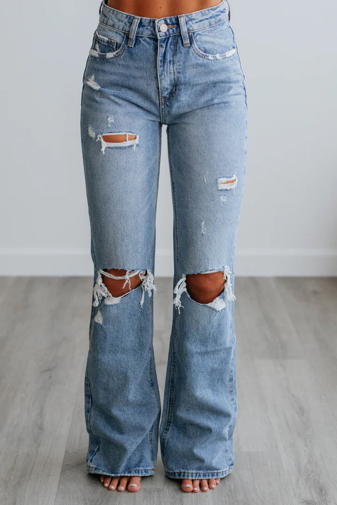 These jeans feature a high-waisted fit that accentuates the waistline while offering a comfortable, structured hold. Designed with a flared leg silhouette (or relaxed wide-leg cut), they balance retro style with modern ease, flowing smoothly from hip to ankle for a flattering, elongated look. A key highlight is the distressed...